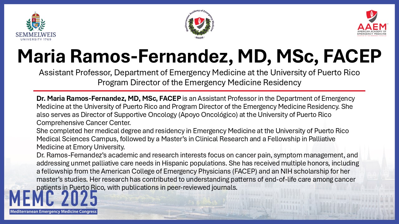 - 17:25 – 17:50: Timing and Impact of ED Palliative Care Referral for an Oncologic Patient – Maria Ramos, MD, MSc, FACEP