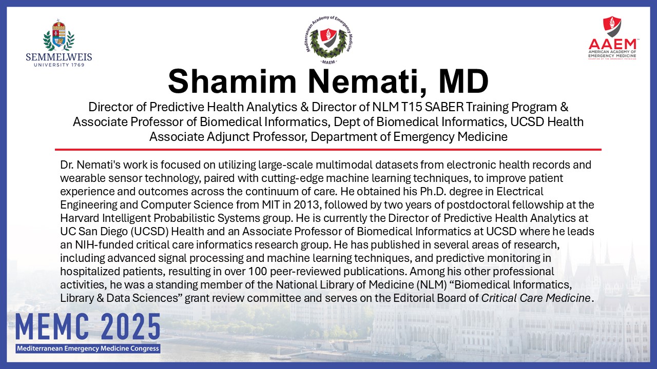 - 11:40 – 12:00: Use of Advanced Analytics in Emergency Medicine – Sama Mokhar, MD